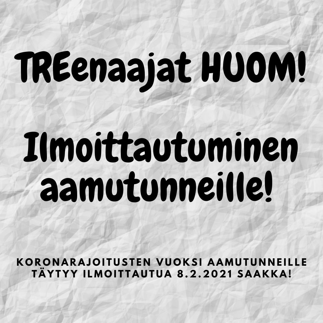 Huom! Paikat täytetään ilmoittautumisjärjestyksessä!Ilmoittautuminen TREenit! ry:n aamutunneille 8.2.2021 saakka!